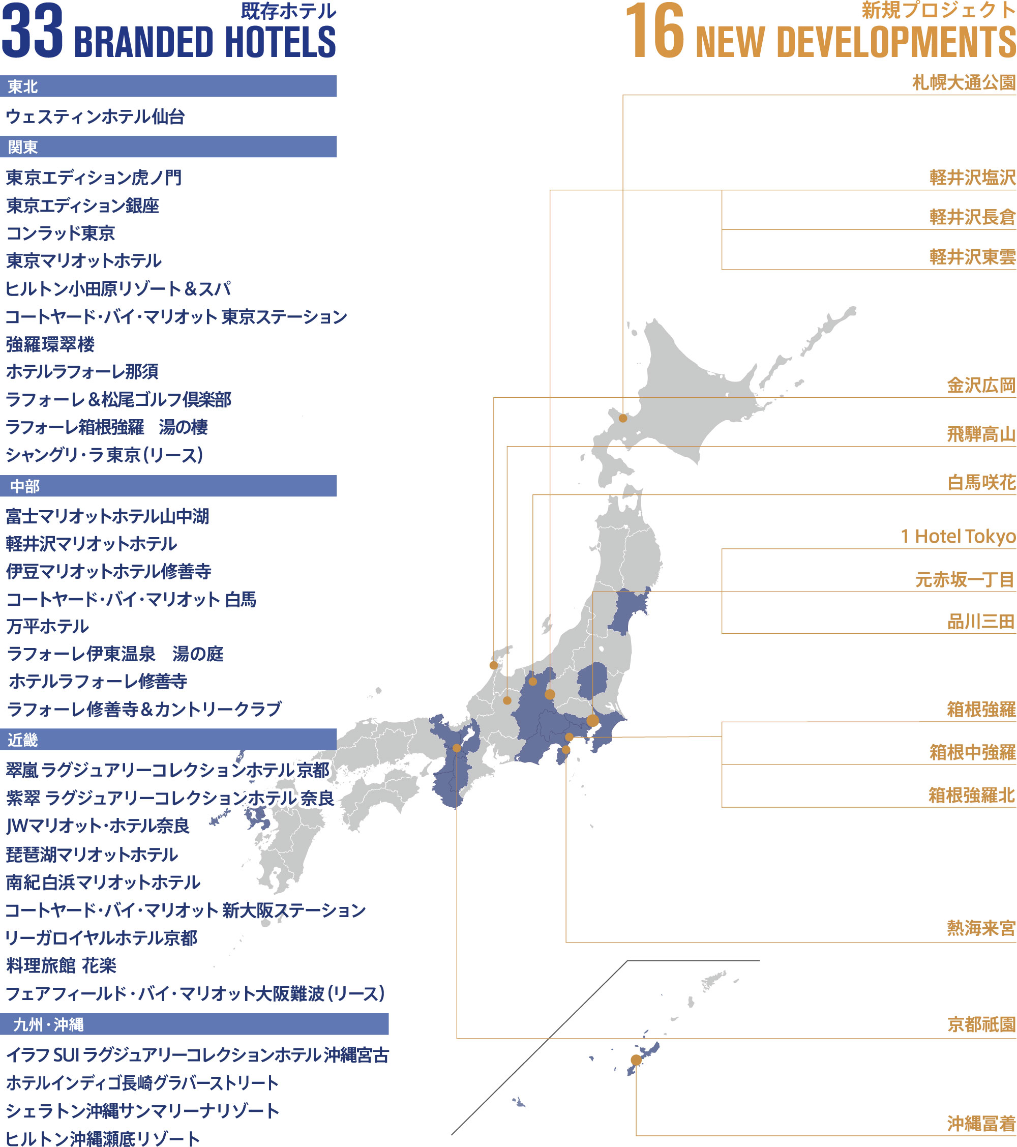 Hotel & resort facilities: 36 (number of rooms: approx. 5,300)
