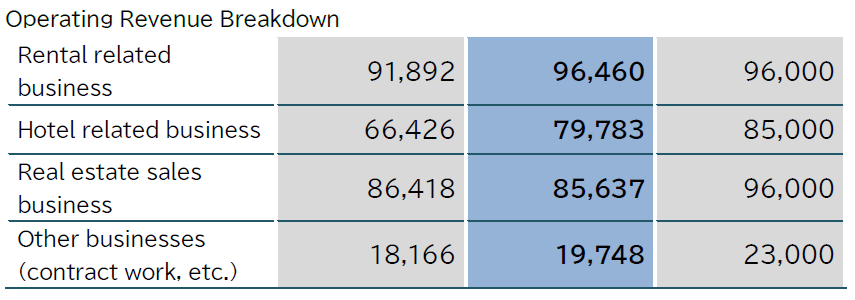- The real estate sales business is expected to generate operating revenue of 96 billion yen, mainly from the residential sales business, while “other business is expected to generate operating revenue of 23 billion yen.