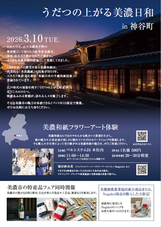 森トラスト株式会社が推進する、日本各地の良品を発掘し国内外に魅力を発信する産業支援プロジェクト「CoCo JAPAN」(ココジャパン)は、岐阜県美濃市と連携し、美濃和紙をはじめとする特産品を紹介する取り組み「うだつの上がる美濃日和」を実施いたします。