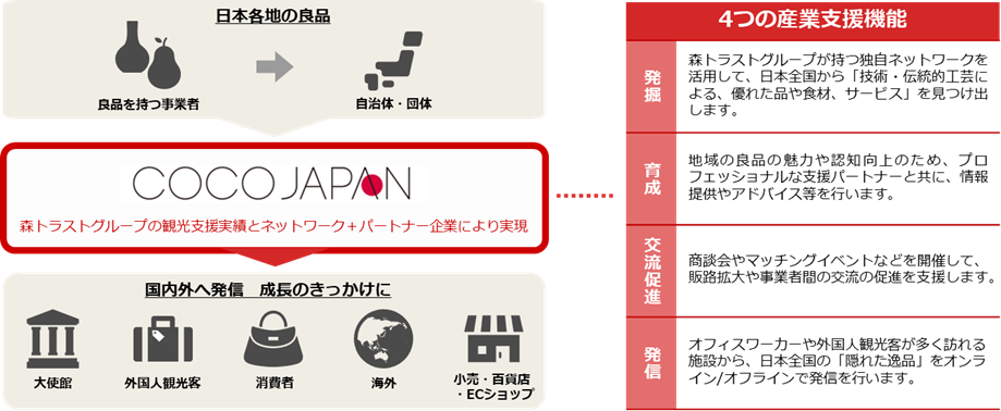 「CoCo JAPAN」は、森トラストグループが東京都港区にあるTOKYO WORLD GATE CoCo Loungeを拠点に、日本各地から魅力ある逸品を発掘し、国内外へと羽ばたくサポートを行うプロジェクトです。都心でのプロモーション機会の提供、森トラストグループのオフィスやホテル施設を利用したイベントの実施、商談会などの販路拡大や成長支援を通じて、日本全国の「隠れた逸品」を発信していきます。