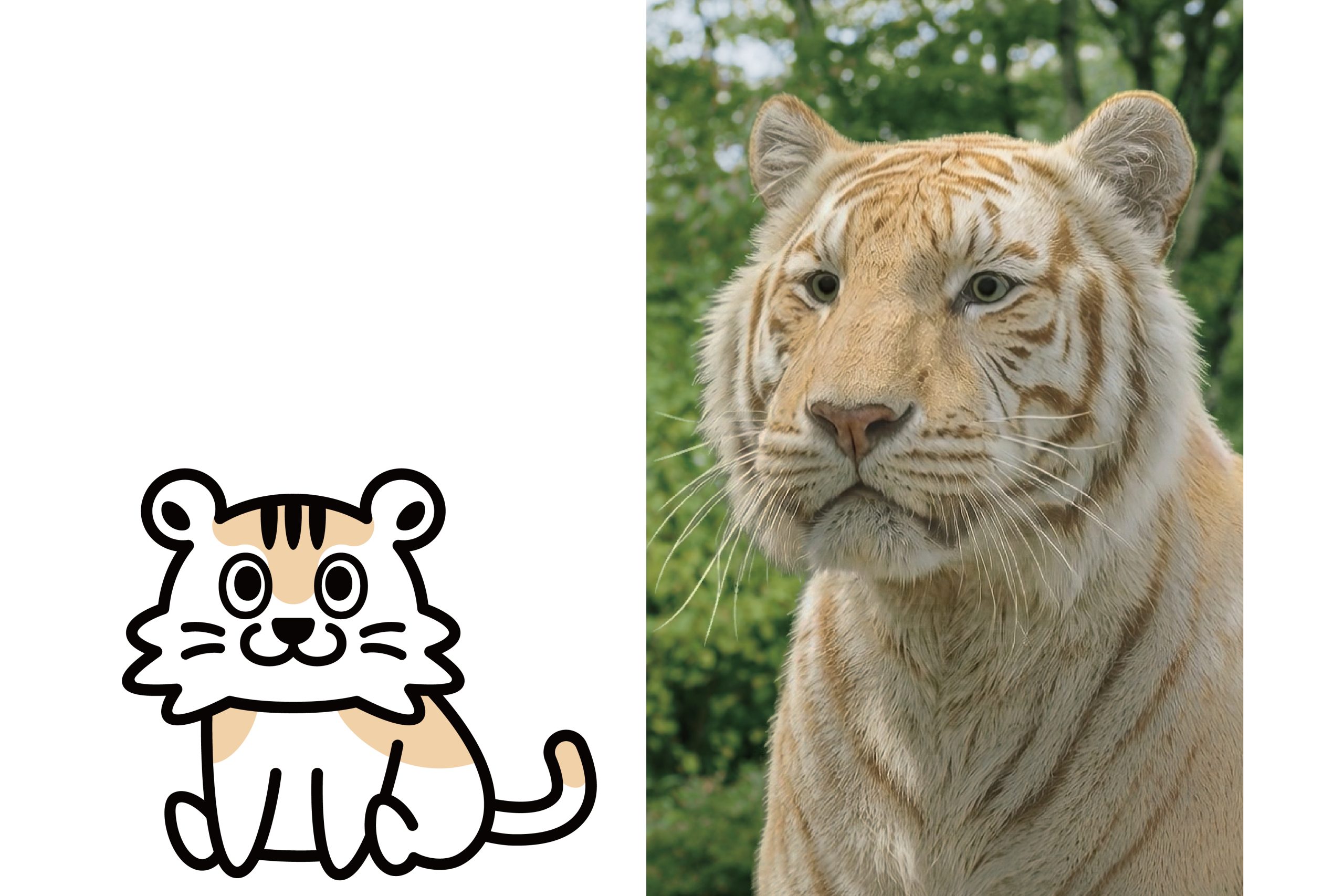 世界に30頭ほどしかいない「金色の毛並み」を有する希少なゴールデンタビータイガー(別名:ストロベリータイガー)をモデルとしたトラのキャラクター。