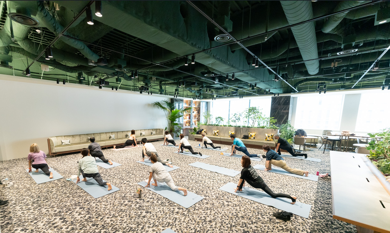 始業前の朝の時間帯に、当社本社オフィスのエントランス空間「ロビー」を開放し、季節のテーマに合わせたリフレッシュヨガプログラムを提供しています。2024年6月の初開催以降、これまでに21回、延べ約360名のワーカーの皆様にご参加いただきました。