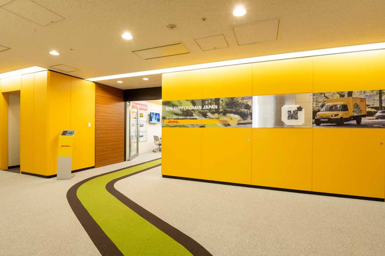 今回のリニューアルでは、オフィス専用部内のみならず共用部のデザインも変更可能な「クリエイティブフロア」を活用し、エレベーターホールや廊下をコーポレートカラーに統一し、フロア全体で「DHLブランド」を表現しました。