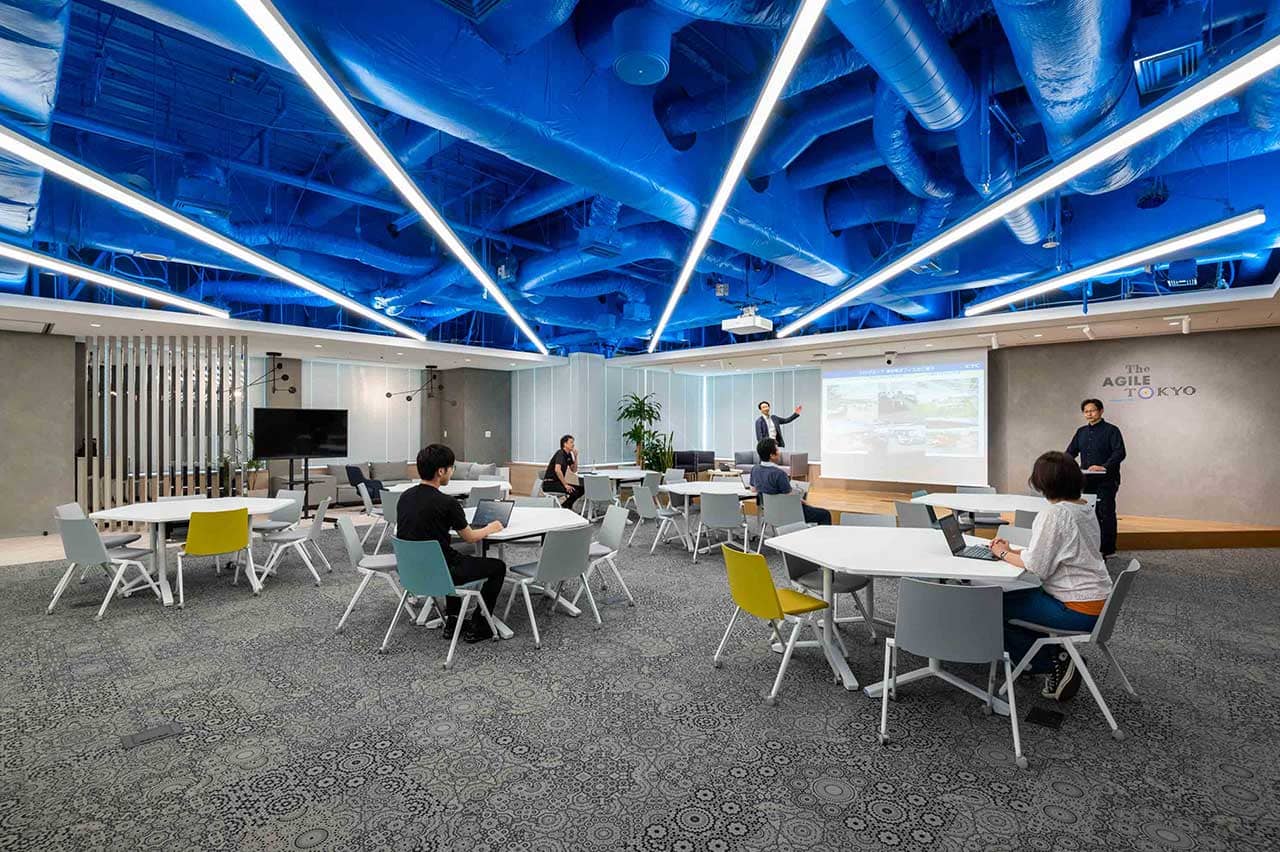 ブランドロゴカラーのブルーに塗られたスケルトン天井がシンボリックで先進的な共創スペース