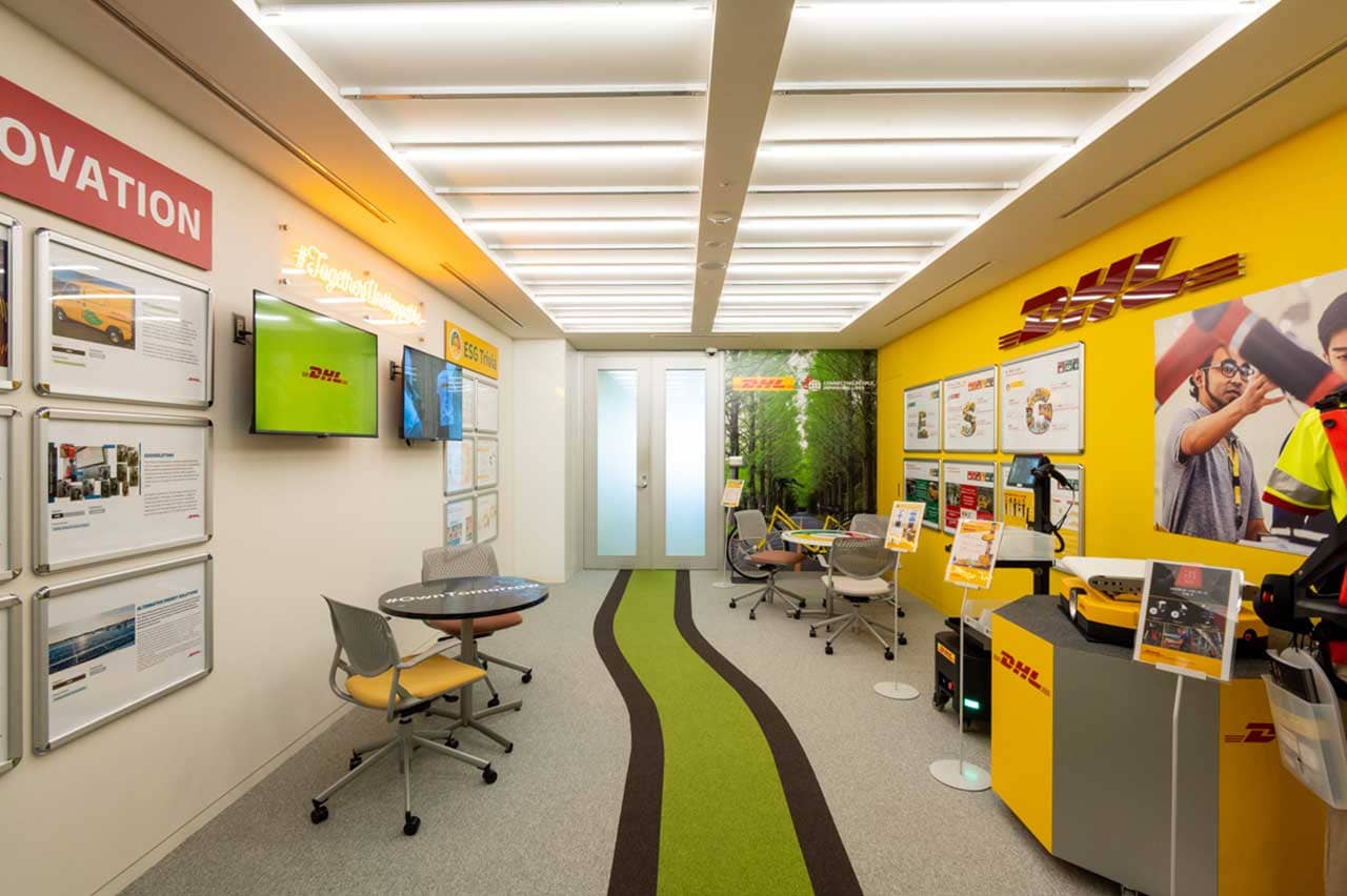 企業メッセージが込められたDHLの“いまと未来”を発信する、ショールームを兼ねたエントランス