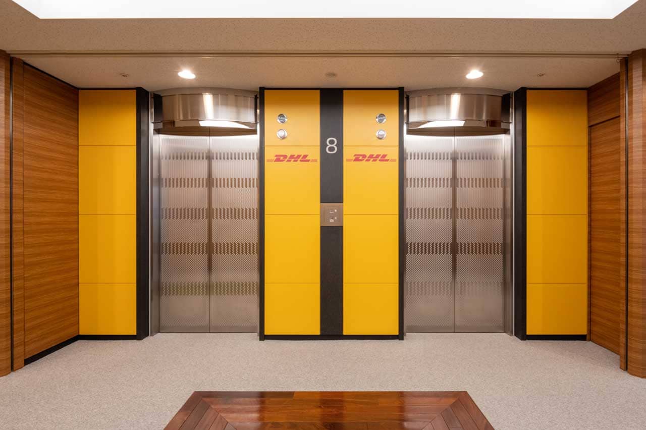 エレベーターの扉が開いた瞬間から一目で「DHL」と分かるデザインに一新
