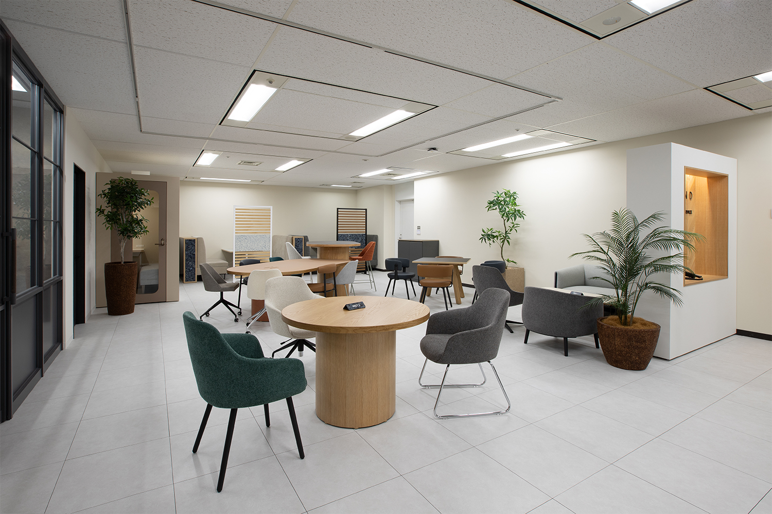 壁際には簡単な打ち合わせができるファミレス席やオンライン会議に対応できるフォンブースも設置。「周りを気にせず話ができるスペースがほしい」「会議室を商談に使いたい」という声が上がっていたことなどから、奥には雰囲気の異なる3つの会議室を用意しました。エントランス左手にあるのはライブオフィス。社員が簡単な打ち合わせなどができるフリースペースになっており、側面はガラスになっているため、中の様子がよく見える設計です。