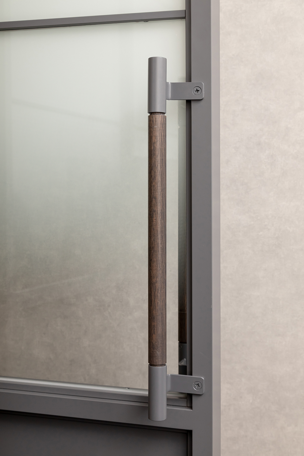 鈴木(裕)氏:オフィスの内装や家具にはスチールを使うことが多く、この会議室のドアもスチールですが、ハンドルの部分のみ木製素材を取り入れました。アスプルンドらしい素材感の表現と、ハンドルを持った時に冷たさを感じさせないといった配慮の、両方の意味を込めています。