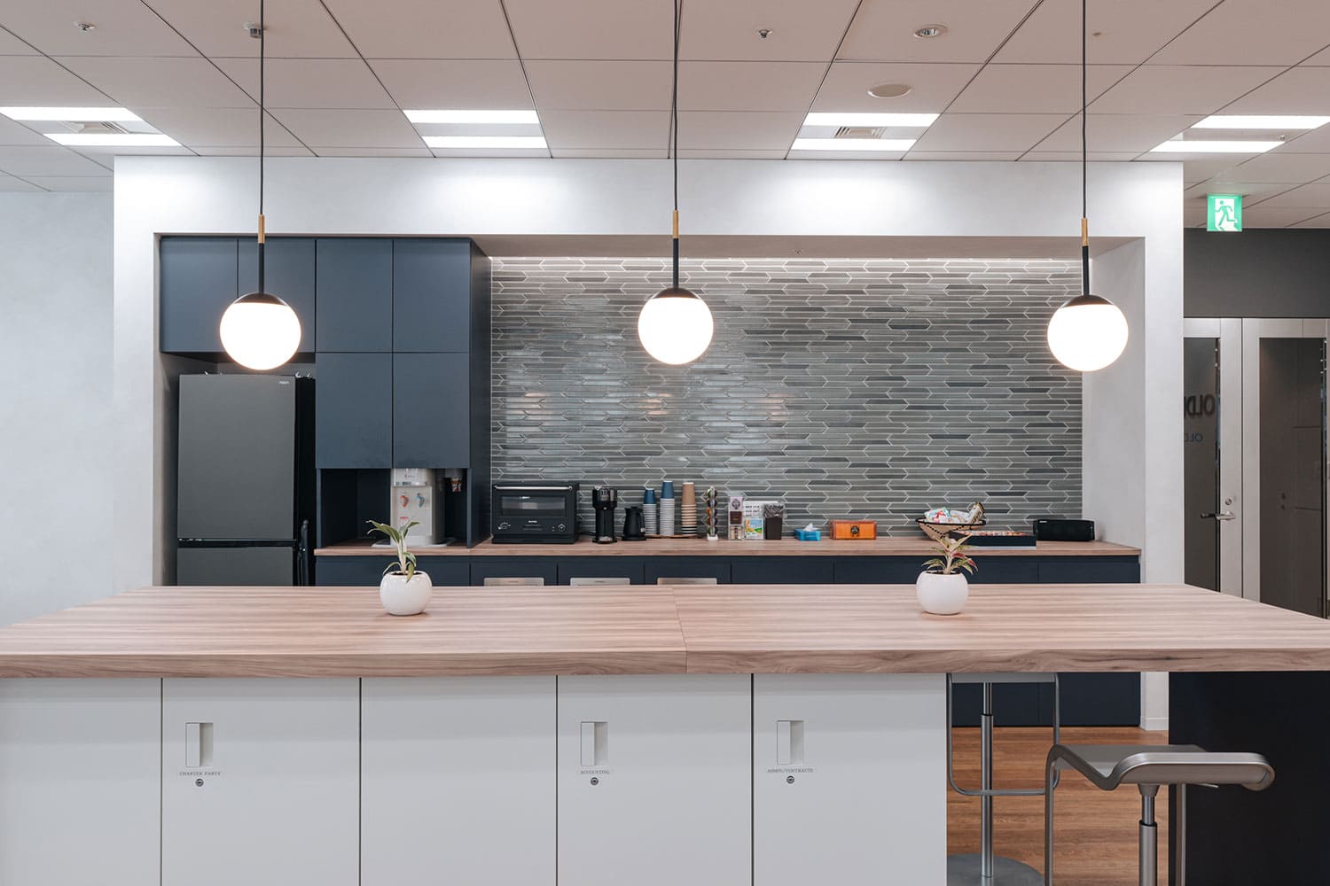 永山氏:応接室や壁を取り払った関係で当初よりエントランス部分が広くなっており、床材を変更するとなると影響範囲も大きくなって費用もかさんでしまうため、コスト効率も踏まえて樹脂材を提案しました。ダイニングキッチンスペースは資料として見せていただいたドバイやシンガポールオフィスのスタイリッシュなトンマナを踏襲しています。家電がすっきり収まる棚をつくり、冷蔵庫とレンジ、ケトルなどはスペースのイメージに合わせて選定して手配いたしました。