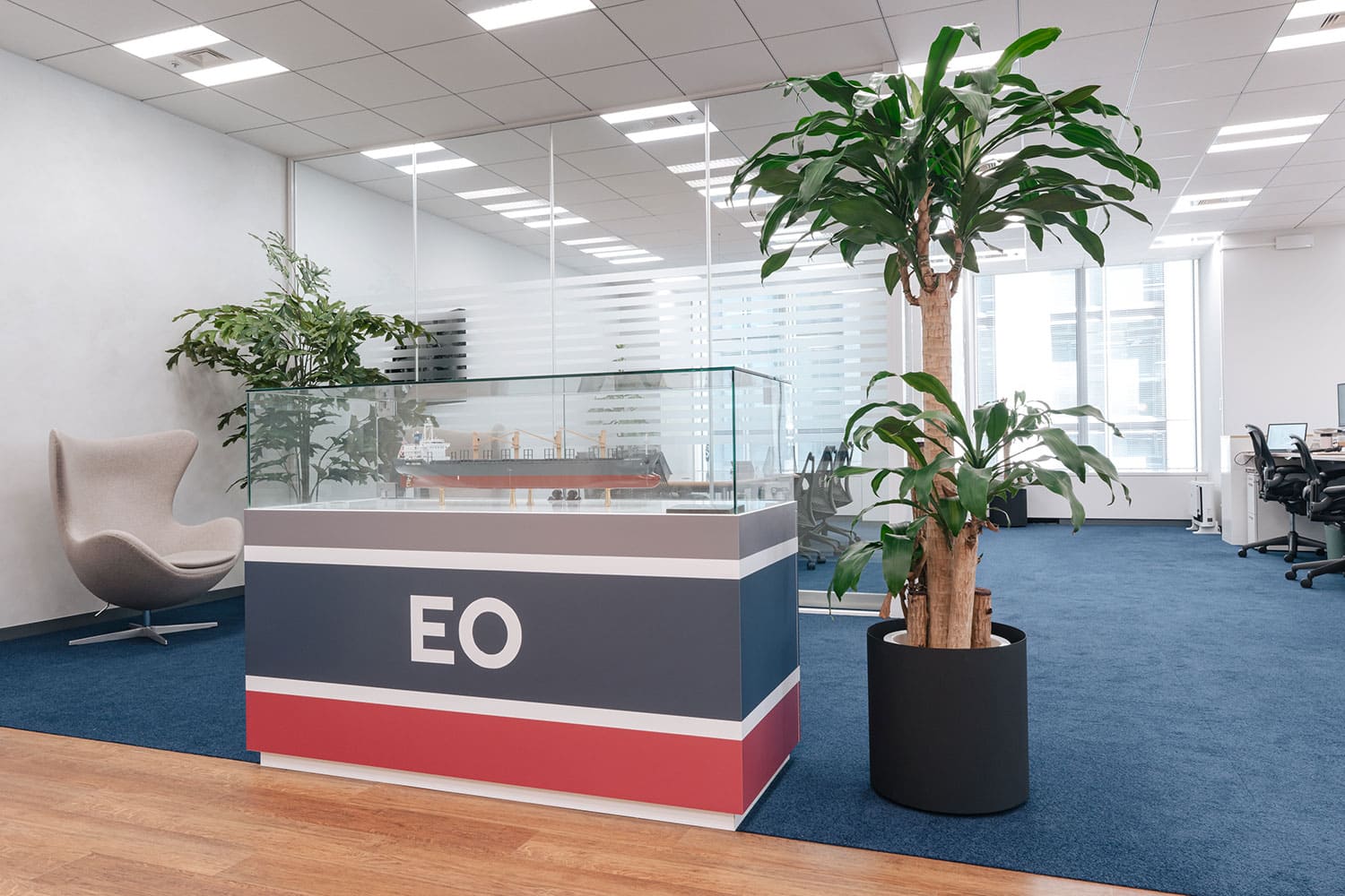 森氏:そうそう、永山さんにうまくディレクションしていただきました。そういえば、入口正面に飾ってある船の模型が入ったショーケースには船と煙突をプリントしているんですが、社名のロゴだと入口横やオフィスドアのロゴと重複してややくどいので会社の船と煙突をシンボルとして入れようと提案してくださったのも永山さんなんですよ。