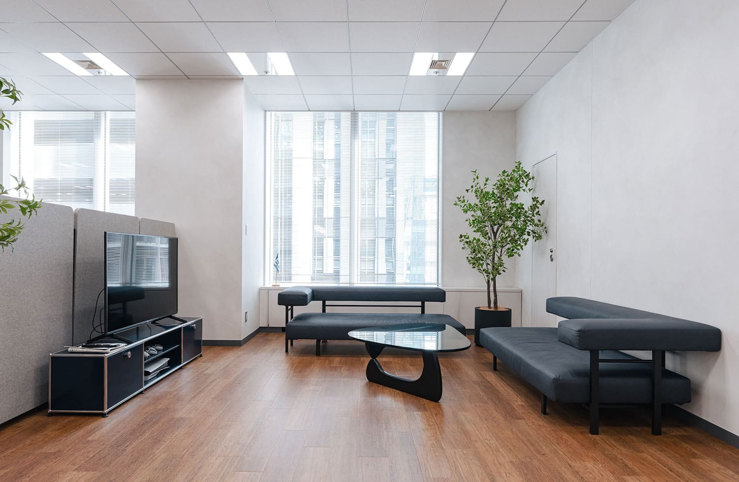家具やインテリアで空間を仕切り、コーポレートカラーをワンポイントに