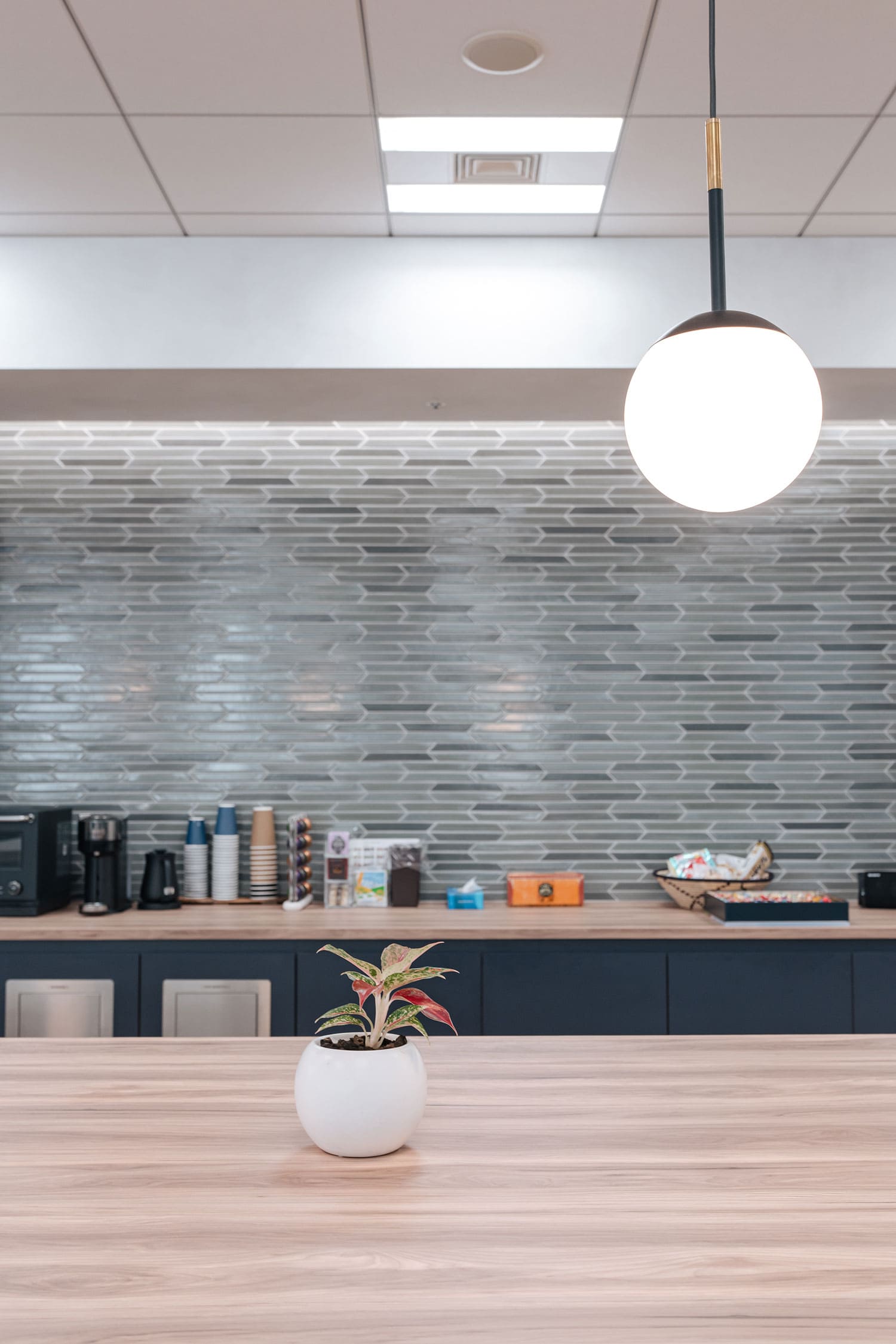 ダイニングキッチンスペースの壁はオフィス全体から見える場所なので、何かアクセントになるものを取り入れたいと思っていました。普通のキッチンタイルだと水回り感が強くなりすぎるので、もう少しインテリアの壁として成立するようなものにできないかと考えました