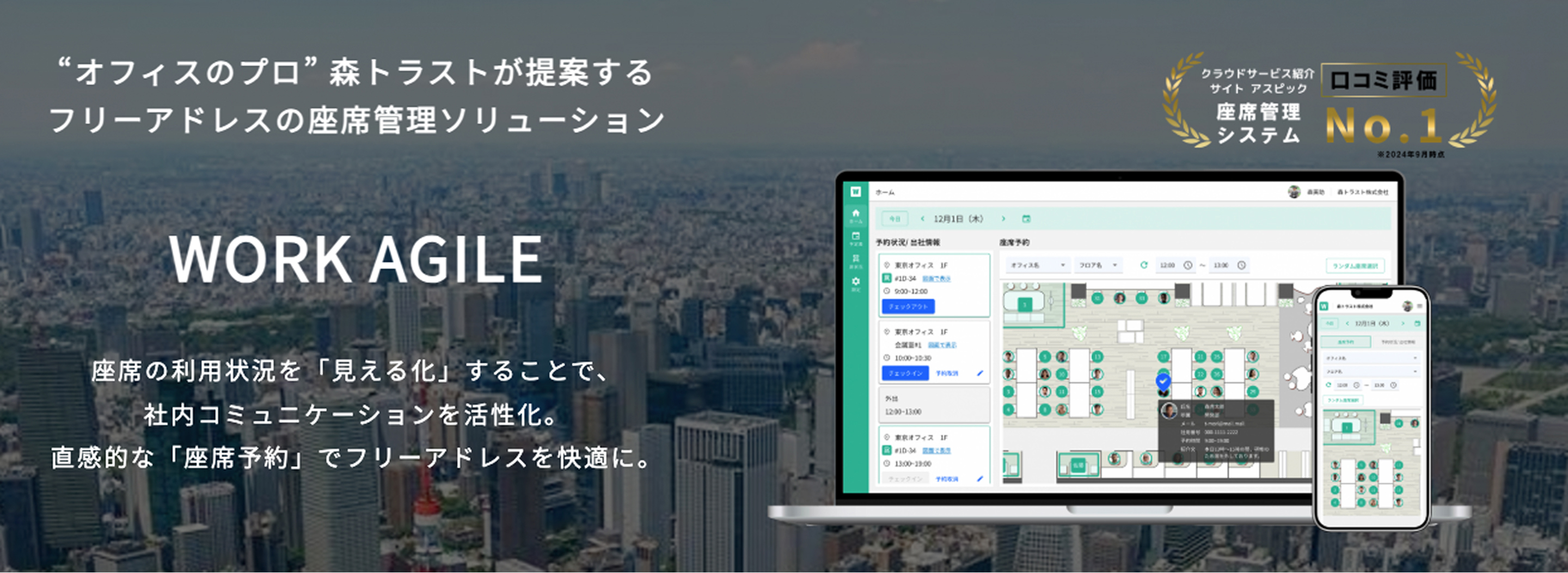 "WORK AGILE"は、フリーアドレスの座席管理ソリューションです。座席の利用状況を「見える化」することで、社内コミュニケーションを活性化、直感的な「座席予約」でフリーアドレスを快適にサポートいたします。